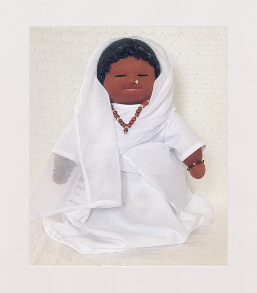 Les vêtements blancs, la robe et le demi-sari sont tous du prasad (confectionnés à partir de tissu utilisé ou béni par Amma). Les bracelets et le collier mala sont faits avec des perles en bois de santal rouge.